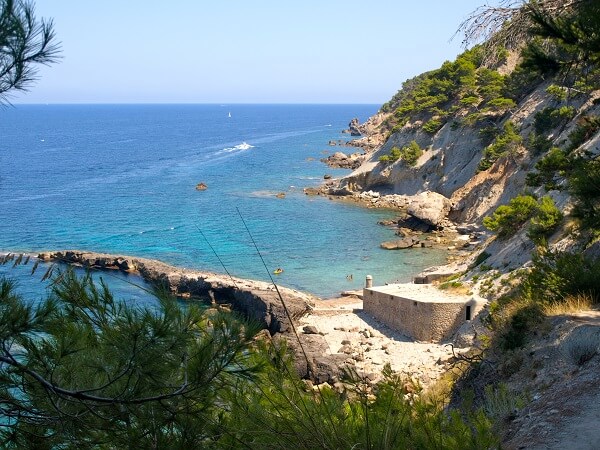 Podríamos decir que Es Portitxol es la cala más típica de Ibiza: con embarcaderos tradicionales donde todavía guardan sus barcas los pescadores locales, y un paisaje increíble de pinares que rodean las rocas y alcantilados. Las aguas oscuras son perfectas para descubrir el fondo marino buceando. Su acceso es también complicado, con un descenso rocoso de unos 20 minutos – ¡no olvidéis el agua, especialmente en los días más calurosos!